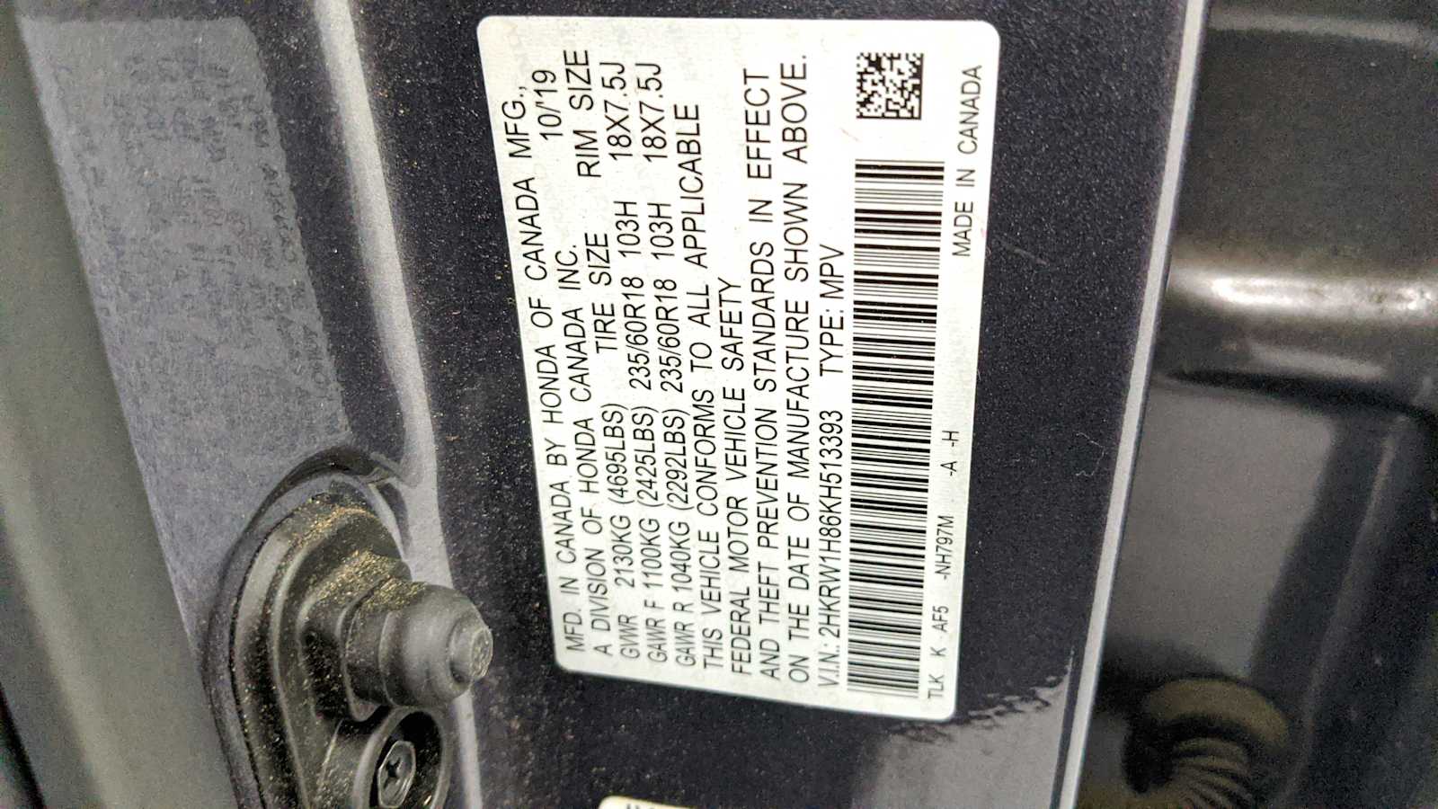- VIN : 2HKRW1H86KH513393